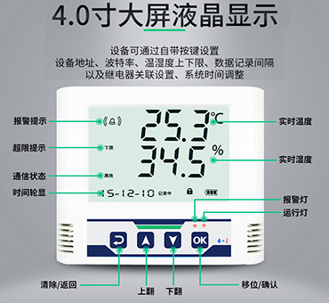 ·產(chǎn)品采用大屏液晶顯示,具有溫濕度上下限雙重控制,自由設(shè)置限制,可以實現(xiàn)高低溫度報警與高低濕度報警并實時顯示。